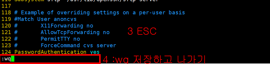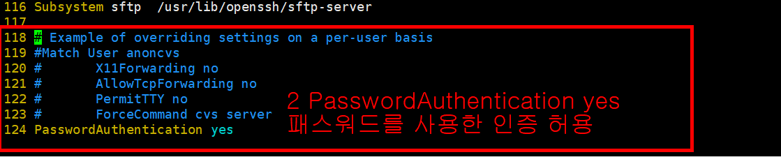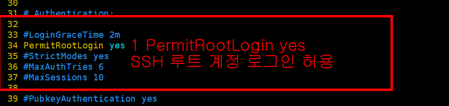 PermitRootLogin, PasswordAuthentication를 yes로 바꿔주어 허용합니다.