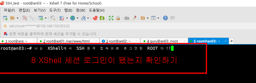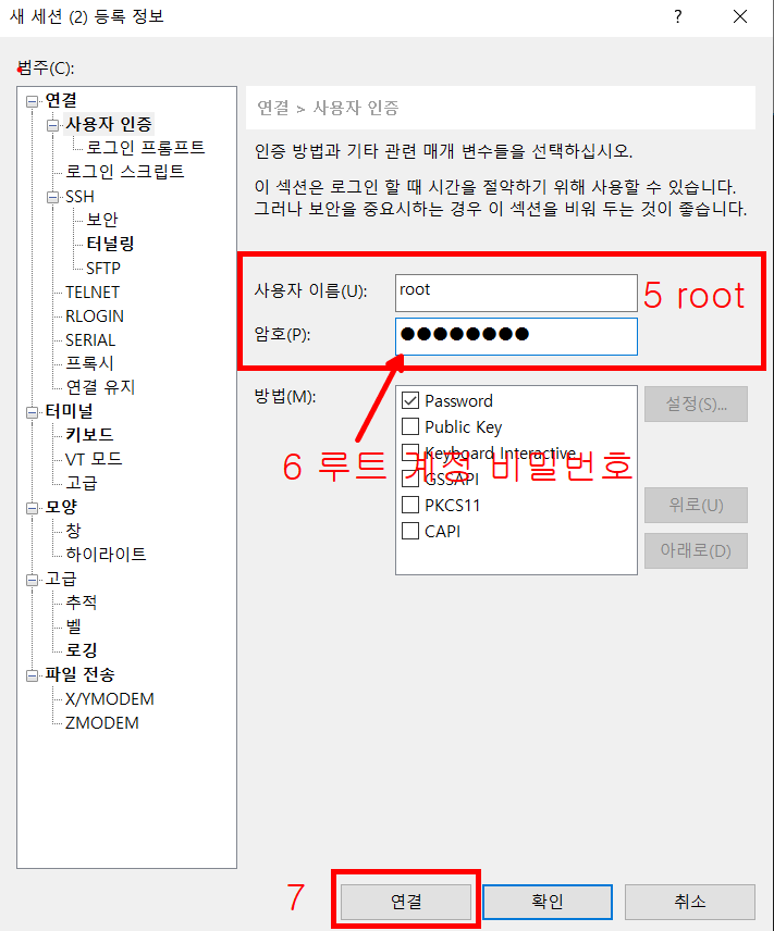 루트 계정 비밀번호를 재설정하여 위에 XShell 세션 정보에 넣어주시면 됩니다.