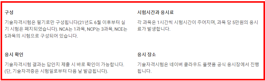 네이버 클라우드에서 공인 교육으로 클라우드 NCP 과정 3일 교육을 받은 후 시험에 응시하였습니다. 교육센터에서 응시료와 교육 기회를 제공받았기 때문에 감사한 마음으로 시험을 신청하고 8월 29일 역삼역에 있는 네이버 클라우드 센터에서 오프라인으로 NCA와 함께 시험을 보고 왔습니다.
