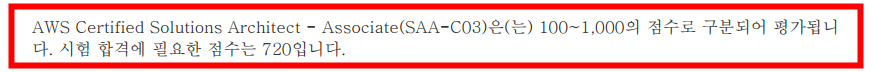 AWS SAA 시험은 커트 라인이 720점인 시험입니다. 그렇다고 시험 점수가 딱딱 떨어지는 시험은 아니고 각 문제마다 배점이 조금씩 상이한 거 같습니다. 65문제가 출제되고 약 15문제는 더미 문제(점수에 들어가지 않는) 문제가 출제되고 점수에 들어가는 문제는 50문제인 것으로 알고 있습니다. 아니라면 죄송합니다. 점수에 들어가는 문제 50문제 중 약 36문제 이상을 맞추게 된다면 합격선일 것 같습니다.