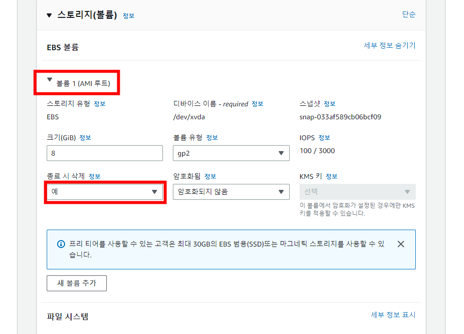 *[예]가 아닐 시 인스턴스가 종료되어도 EBS 스토리지가 삭제되지 않아서 과금이 발생할 수 있습니다.