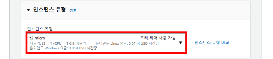 다음으로 인스턴스 유형에서 t2.micro를 설정합니다.