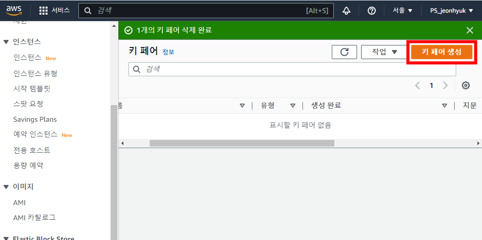 좌측 하단 EC2 대시보드에서 [키 페어]를 선택합니다.