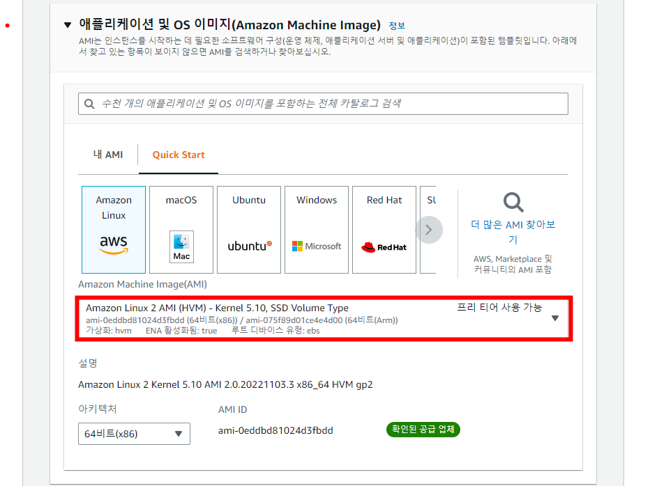 애플리케이션 및 OS 이미지(Amazon Machine Image)에서 Amazon Linux 2 AMI를 선택해주세요.