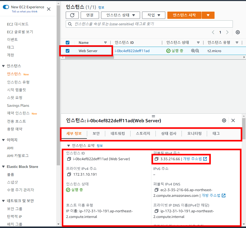 인스턴스를 선택하면 하단에 인스턴스의 상세 정보를 확인할 수 있습니다.