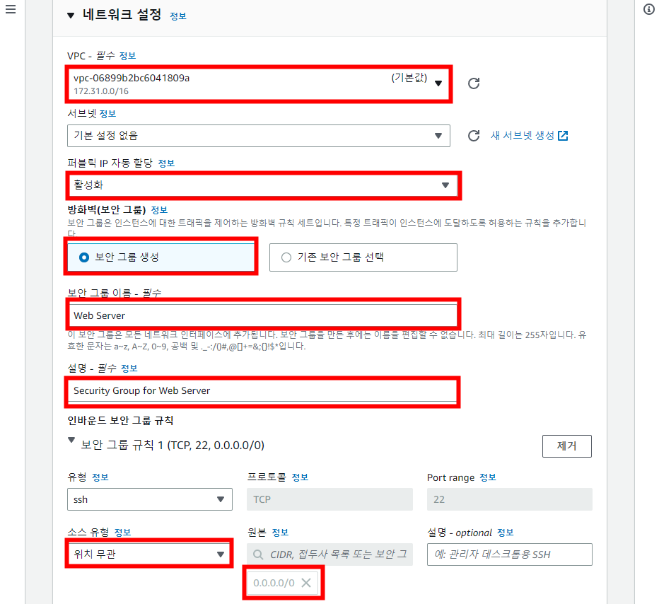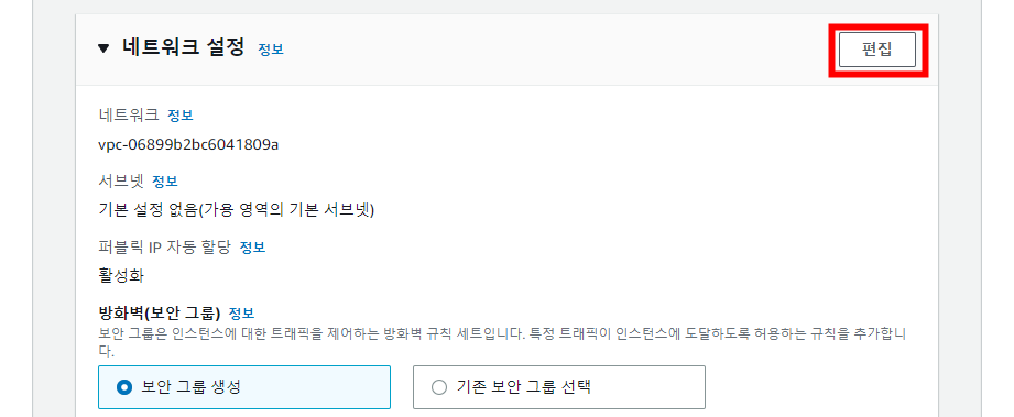VPC는 기본값으로 두고 퍼블릭 IP 자동 할당도 활성화합니다. 외부에서 EC2에 접속하기 위해 퍼블릭 IP가 필요합니다.