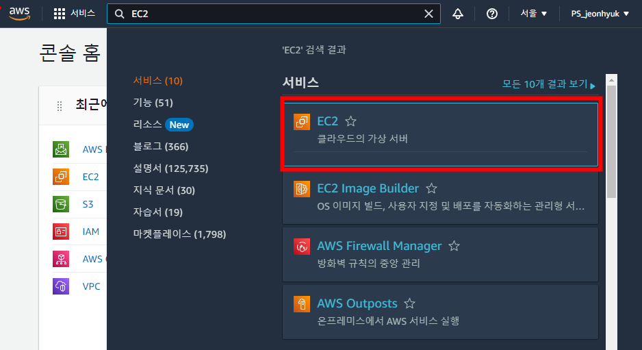 콘솔 상단에 검색창에 EC2를 검색한 후 선택합니다.