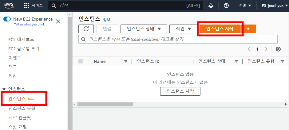 좌측에 EC2 대시보드에서 [인스턴스]를 선택합니다. [인스턴스 시작]을 누르면 새로운 인스턴스를 생성할 수 있습니다.