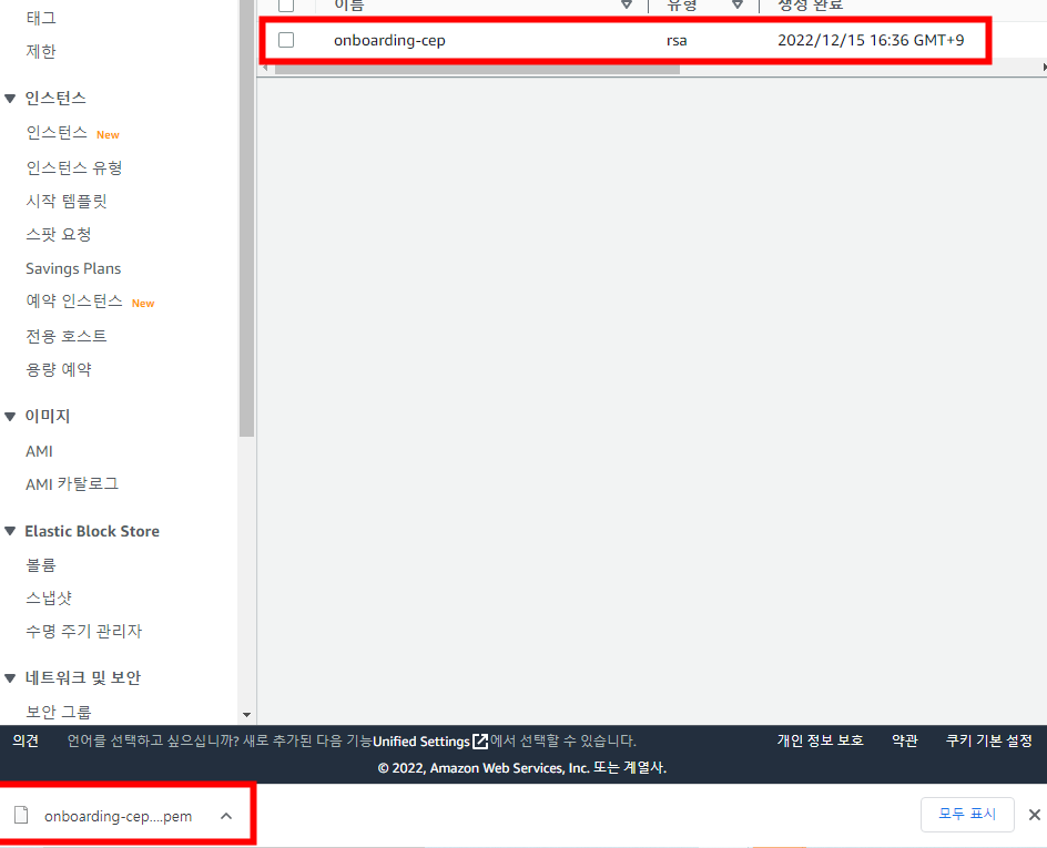 *private key 파일은 다시 다운로드 되지 않으니 분실 시 복원할 수 없으니 잘 관리해야 합니다.