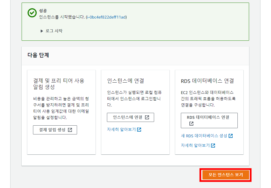 인스턴스가 정상적으로 시작되면 성공과 함께 시작 메세지가 뜹니다. [모든 인스턴스 보기]를 눌러 생성된 인스턴스를 확인합니다.