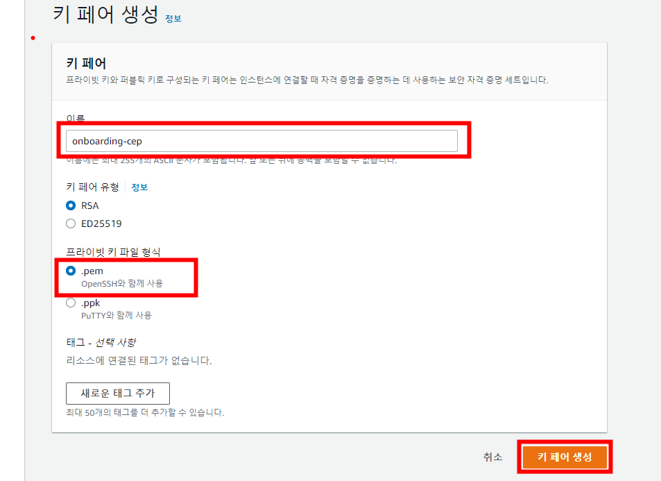 키 페어의 이름을 지어주시고 프라이빗 키 파일 형식을 지정한 후 [키 페어 생성]을 누릅니다.