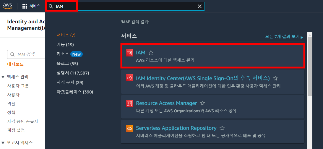 콘솔 상단에 IAM을 검색한 후 IAM 서비스를 선택한 후 이동합니다.
