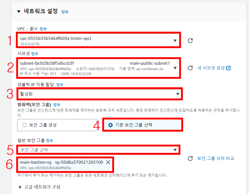 VPC는 이전 포스팅에서 생성했던 main-vpc를 선택해주시고, 서브넷은 퍼블릭 서브넷 1에, 퍼블릭 IP 자동 할당 활성화,기존 보안 그룹 선택에서 이전 포스팅에서 만들었던 main-bastion-sg 보안 그룹을 적용해 줍니다.
