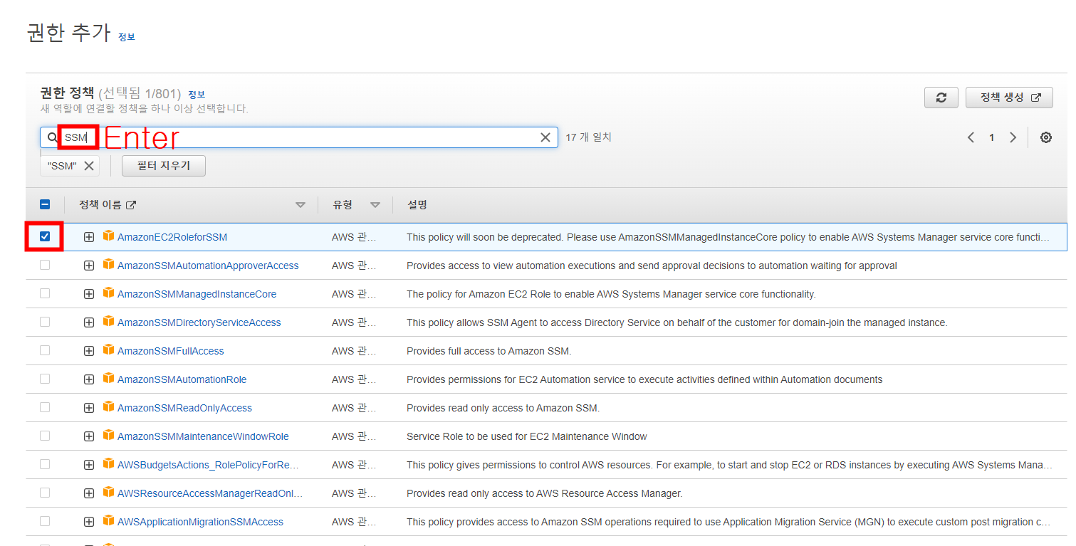 권한 추가 화면에서 검색창에 SSM을 검색한 후 필터링된 결과 중에서 AmazonEC2RoleforSSM을 선택한 후 [다음]을 눌러줍니다.