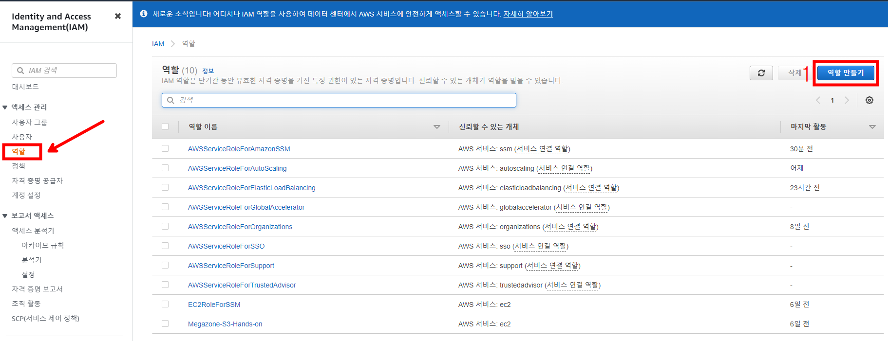 IAM 대시보드에서 역할을 선택한 후 우측 상단에 있는 [역할 만들기] 버튼을 눌러 IAM 역할을 생성해보도록 하겠습니다.