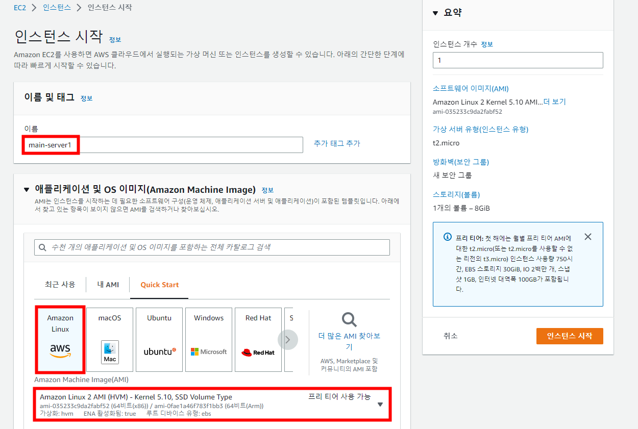 인스턴스의 이름은 그냥 main-server1으로 적당히 지어주고 OS로는 아마존 리눅스 가장 최신 버전을 선택해 주었습니다.