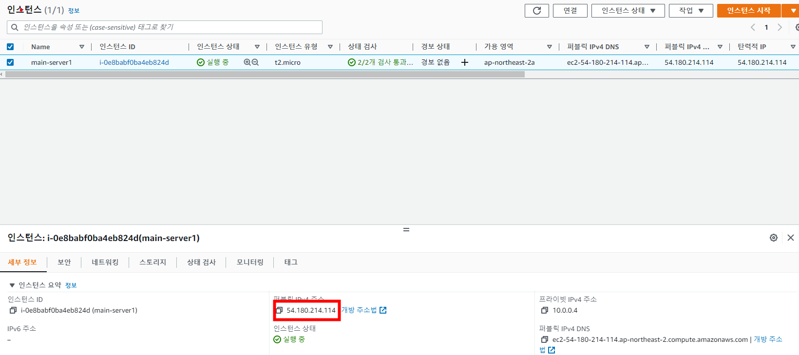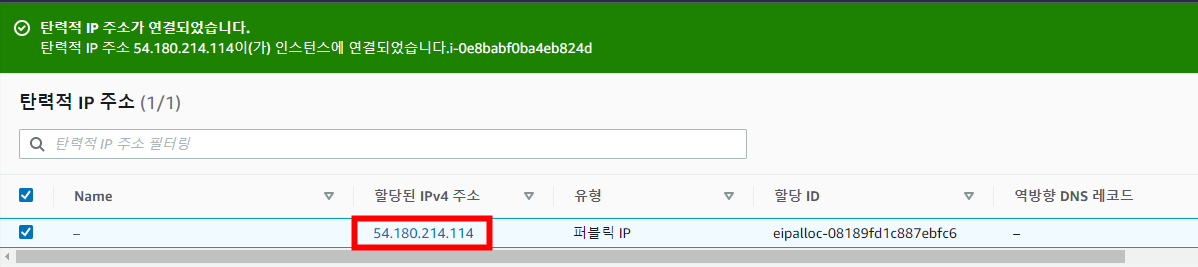 EIP가 연결됐는지 확인해 봐야겠죠? EIP는 54.180.214.114인데 인스턴스에서 퍼블릭 IPv4가 54.180.214.114로 바뀐 것을 확인할 수 있습니다.EIP가 인스턴스의 고정 IP로 붙은 모습입니다.