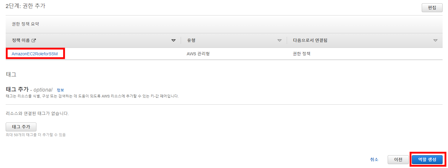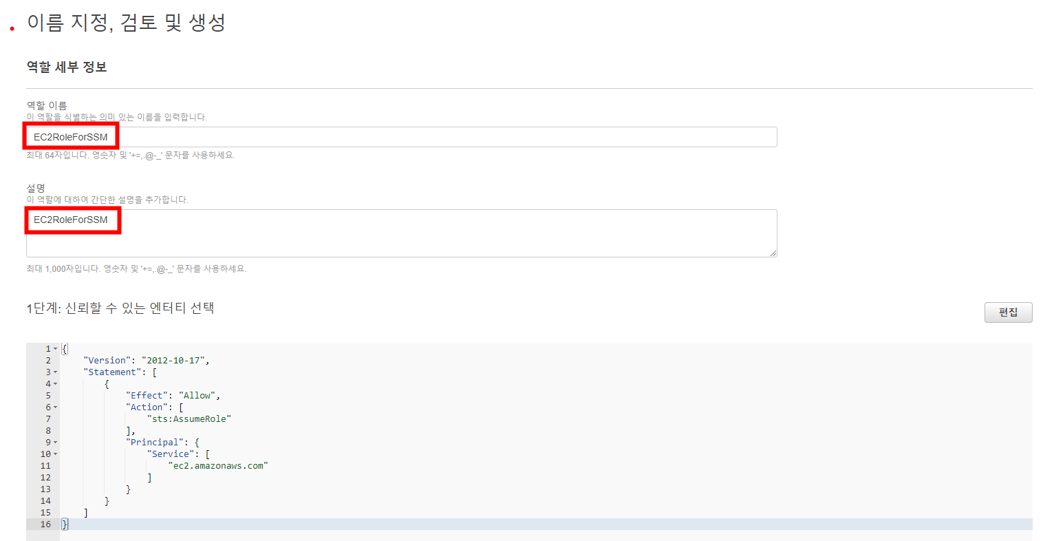 다음과 같이 IAM 역할의 이름과 설명 부분을 EC2RoleForSSM과 같이 적당한 이름으로 부여해준 후 [역할 생성] 버튼을 눌러 역할을 생성해 줍니다.