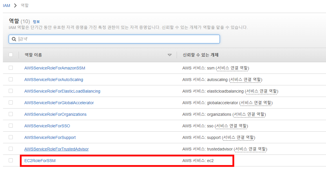 IAM 대시보드를 확인하시면 방금 전에 생성한 EC2RoleForSSM이 생성된 것을 확인할 수 있습니다.
