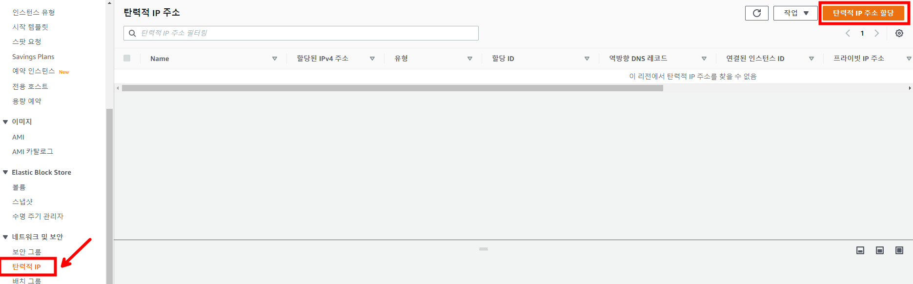 EIP는 좌측 대시보드에서 탄력적 IP를 가리킵니다. 선택한 후 우측 상단에 [탄력적 IP 주소 할당]을 눌러줍니다.