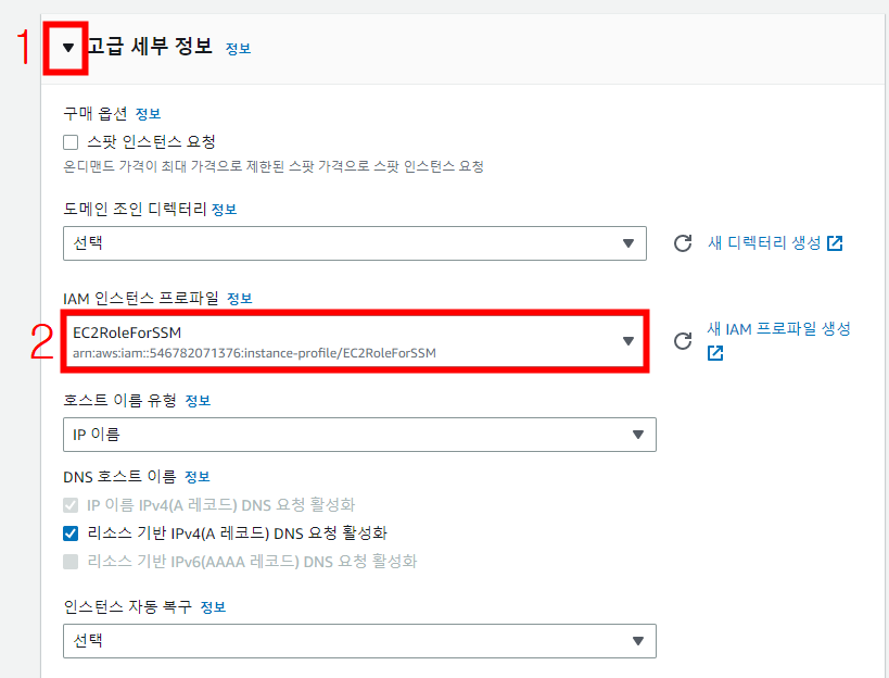 다음과 같이 고급 세부 정보의 토글 버튼을 누른 후 생성해주었던 IAM 역할인 EC2RoleForSSM을 프로파일에 적용시켜 주고