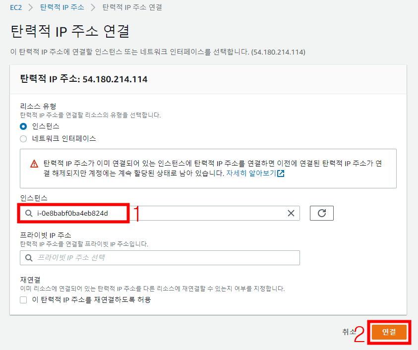 다음과 같은 화면에서 인스턴스로 아까 생성했던 인스턴스를 [연결] 버튼을 눌러 연결합니다.*재연결 옵션의 경우 탄력적 IP가 다른 인스턴스와 연결된 상태에서 손쉽게 재연결할 수 있도록 도와주는 옵션입니다.