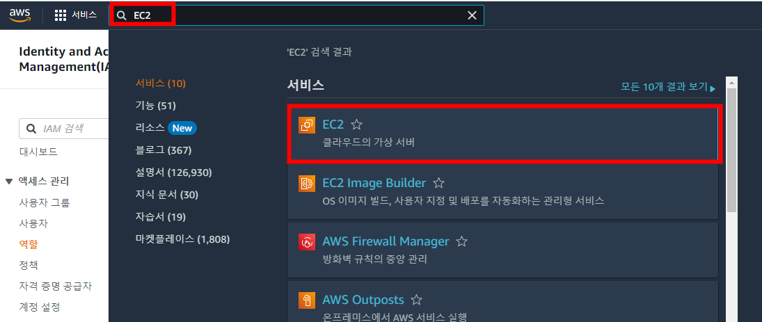 콘솔 상단에 EC2를 검색한 후 EC2 서비스를 선택합니다.