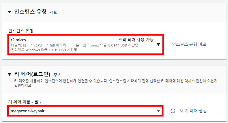 인스턴스 유형은 기본 값인 t2.micro, 키 페어는 기존에 가지고 있던 키 페어를 등록했습니다.없으시면 옆 쪽에 [새 키 페어 생성] 버튼을 눌러서 생성하신 후 인스턴스 생성 해주세요.