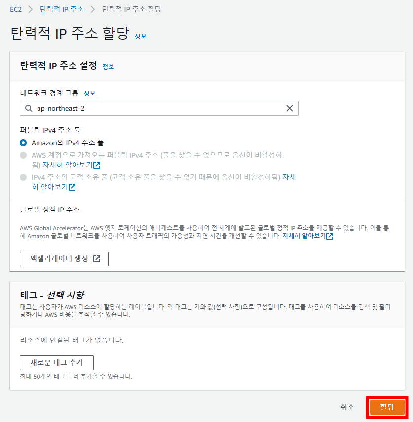 [할당] 버튼을 눌러 EIP를 할당받습니다.