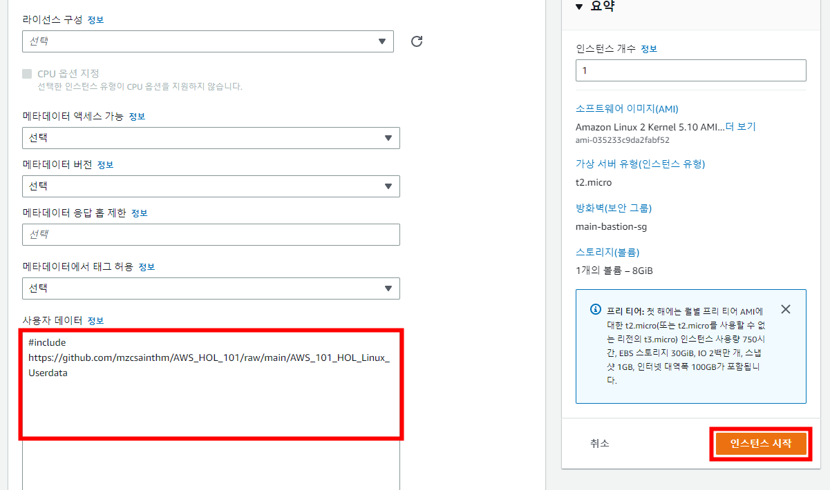 유저 데이터(사용자 데이터)에 다음과 같은 코드를 복사 붙여넣기한 후에 우측에 [인스턴스 시작] 버튼을 눌러 인스턴스를 시작합니다.
