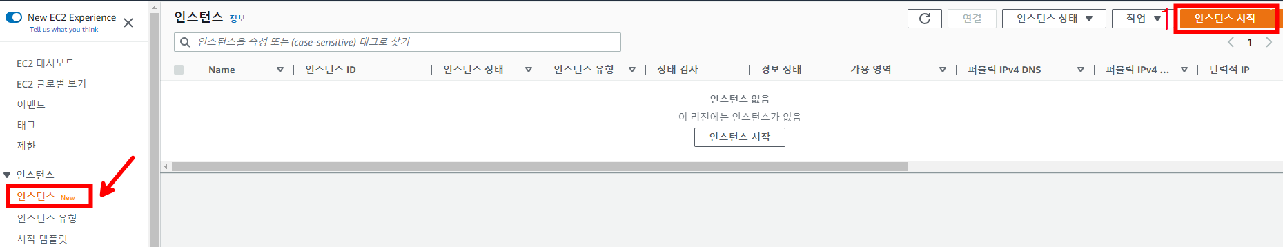 대시보드에서 인스턴스를 선택한 후 우측 상단에 있는 [인스턴스 시작] 버튼을 눌러 인스턴스를 만들어 보겠습니다.