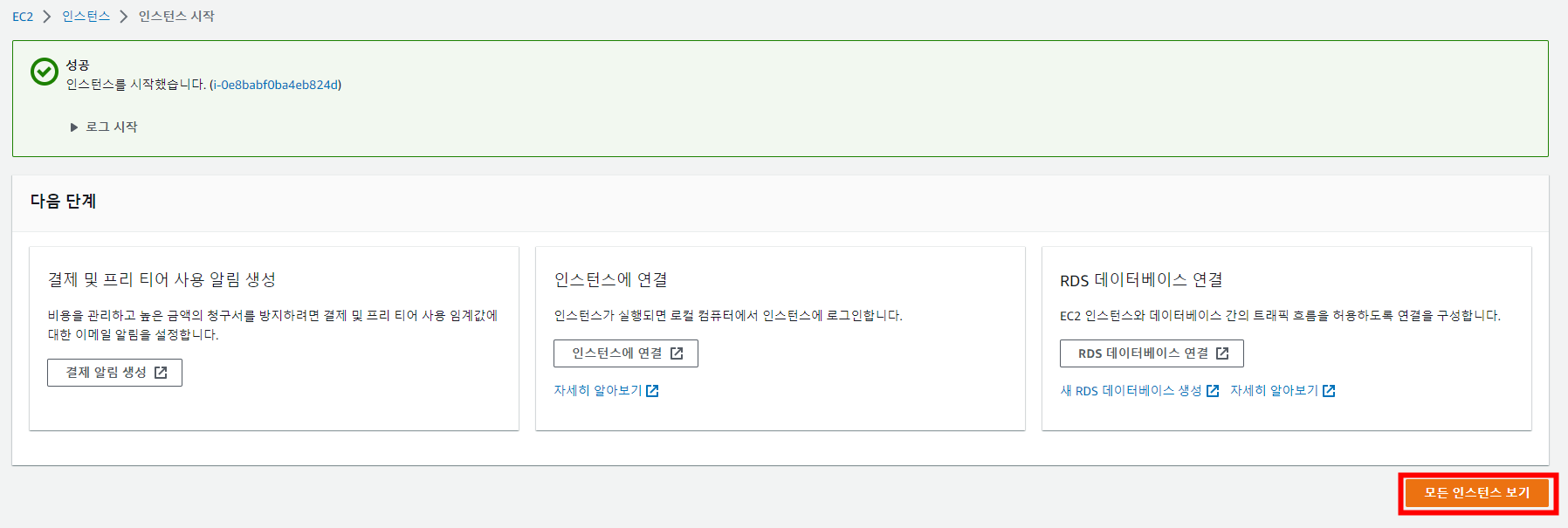 인스턴스가 성공적으로 만들어졌다면 다음과 같이 인스턴스를 시작했다는 메시지가 나오는데 [모든 인스턴스 보기] 버튼을 눌러주세요.