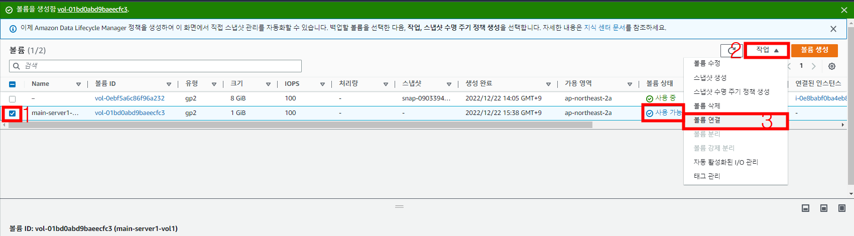 볼륨이 생성되었다면 볼륨 상태가 사용 가능 상태인지 확인한 후 볼륨을 체크하여 [작업] - [볼륨 연결]을 눌러 인스턴스와 연결합니다.