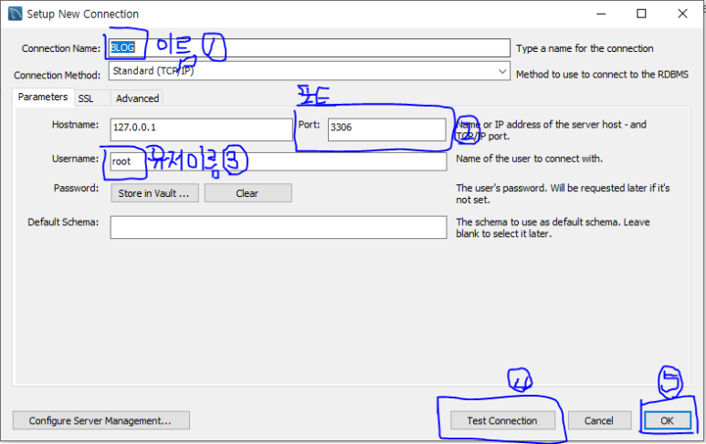이름은 그냥 아무렇게나 설정해 주시고 번호 순서대로 확인해 주세요. 포트 번호, 유저 이름, 패스워드를 테스트 커넥션 OK 순서대로 진행해 주시면 됩니다. 그럼 BLOG라는 이름의 커넥션이 생성되는데 이걸 눌러서 들어가주시면 됩니다.