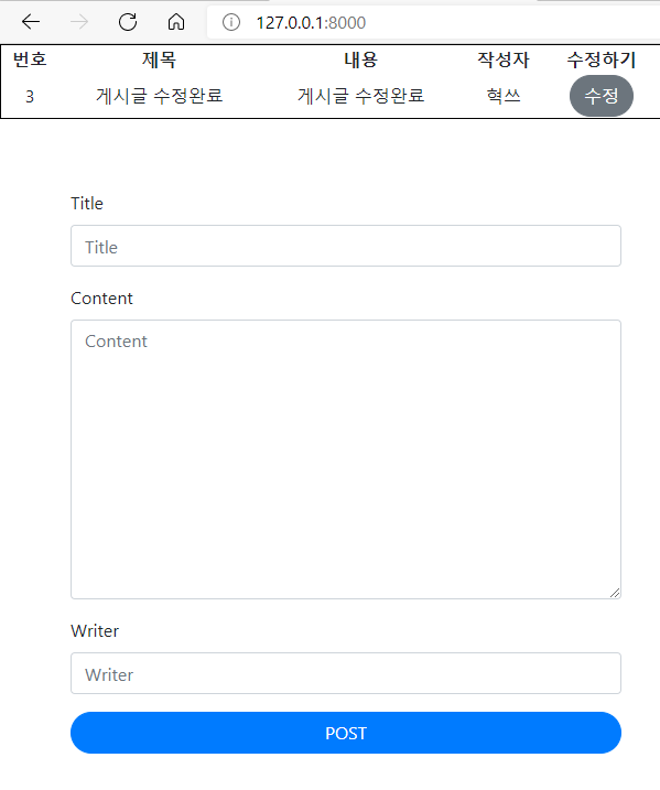 아직 회원가입 기능을 만들어주지 않아서 writer를 직접 입력해 주어야 하지만 회원가입을 만들어서 User 정보를 받아 Writer를 자동으로 만들어줄 수 있습니다. POST 버튼을 눌렀을 때 게시글이 생성되는 간단한 실습을 진행했습니다.