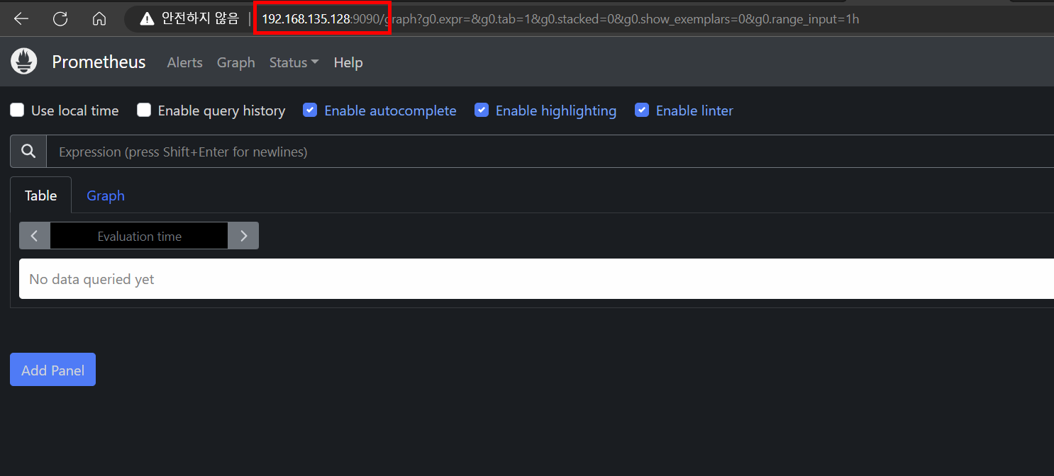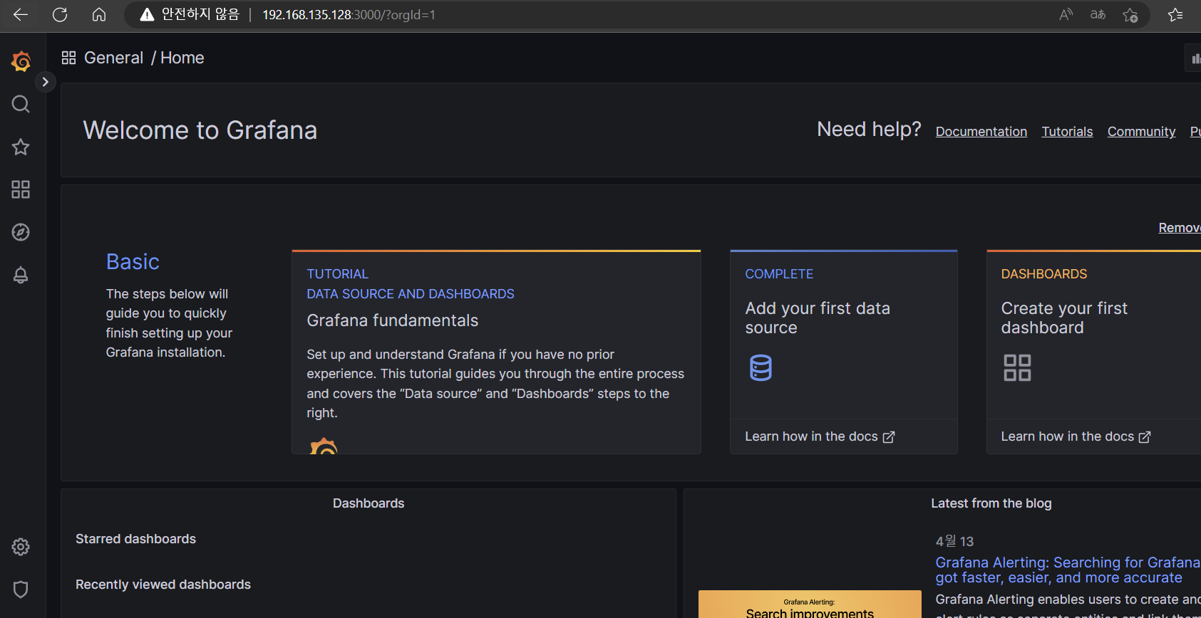 브라우저에서 Grafana GUI 웹에 접속하는데 저의 경우 [192.168.135.128:3000] [192.168.135.128:9090] 입니다.