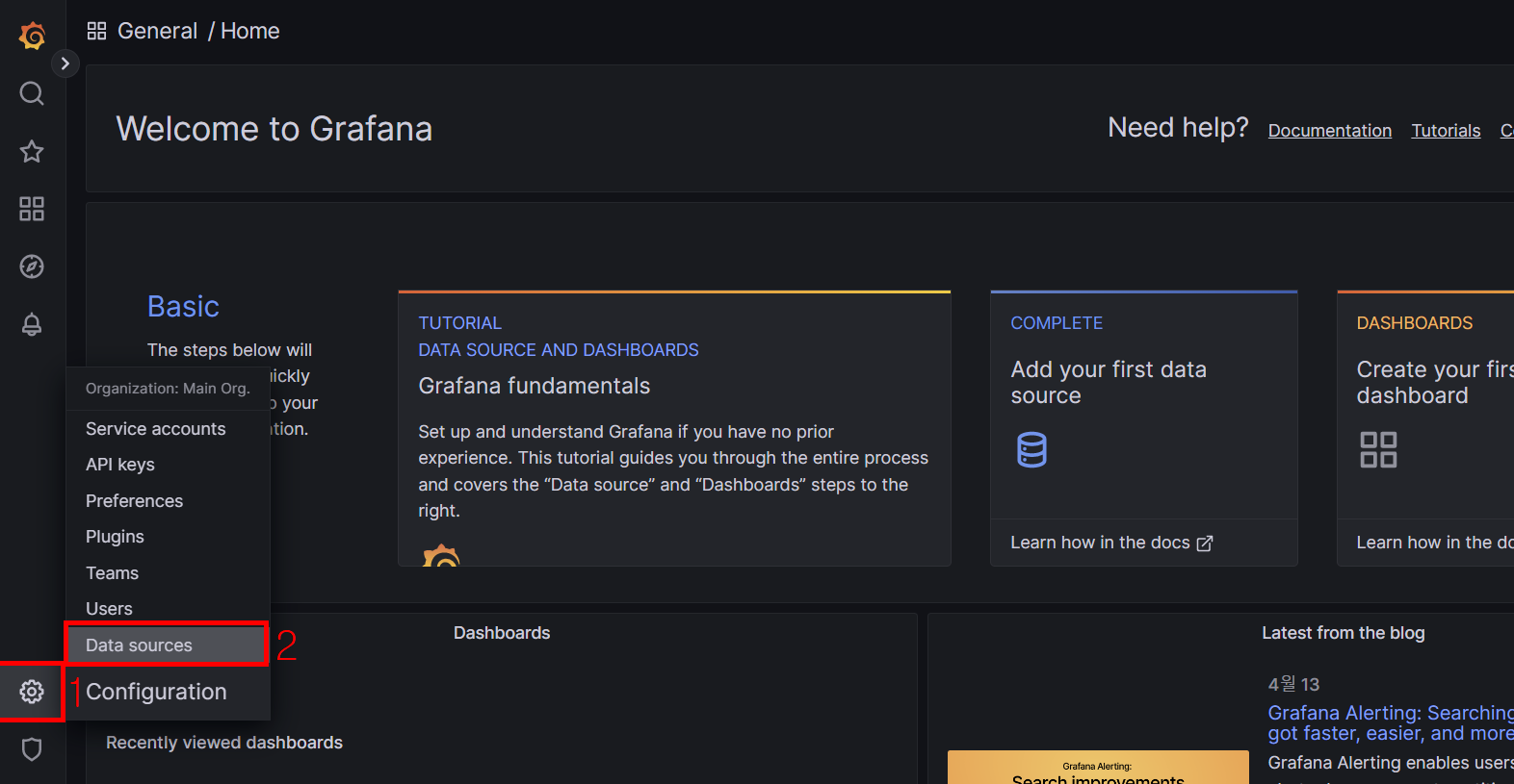 Grafana Home에서 좌측 하단에 있는 [Configuration] - [Data sources]를 선택합니다.