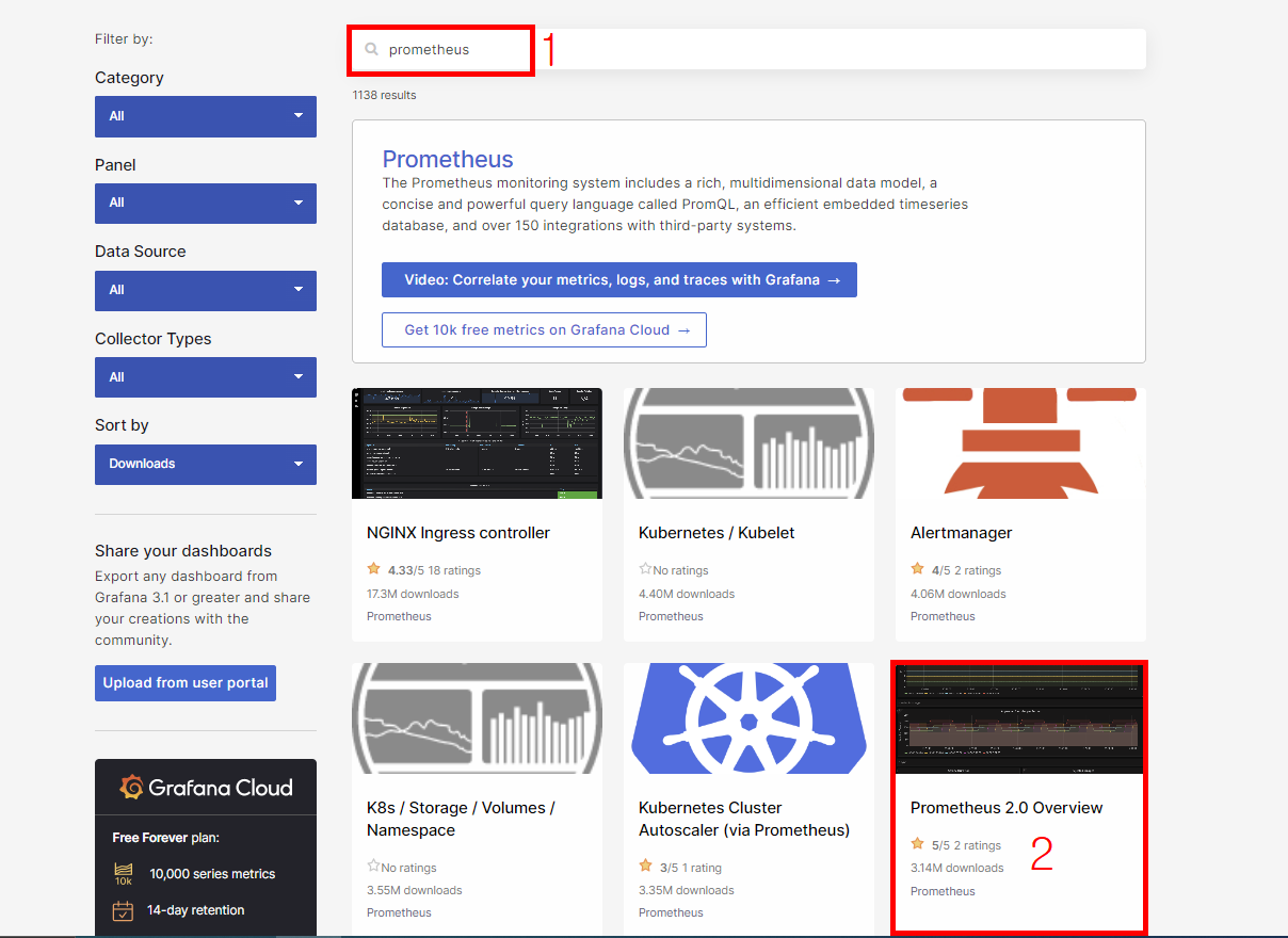 위 링크에 접속해서 Prometheus를 검색한 후 적당한 대시보드를 골라줍니다. 저는 적당히 Prometheus 2.0 Overview를 선택했습니다. [Copy ID to clipboard]를 눌러 ID를 클립보드에 저장합니다.