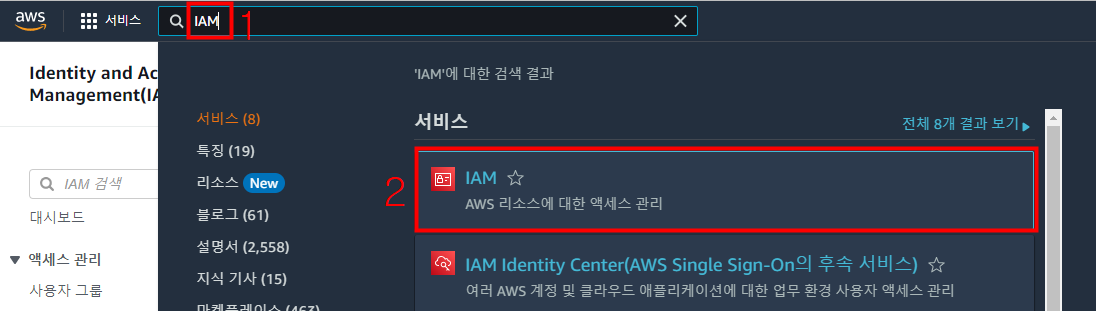 콘솔에서 IAM을 검색한 후 선택합니다.