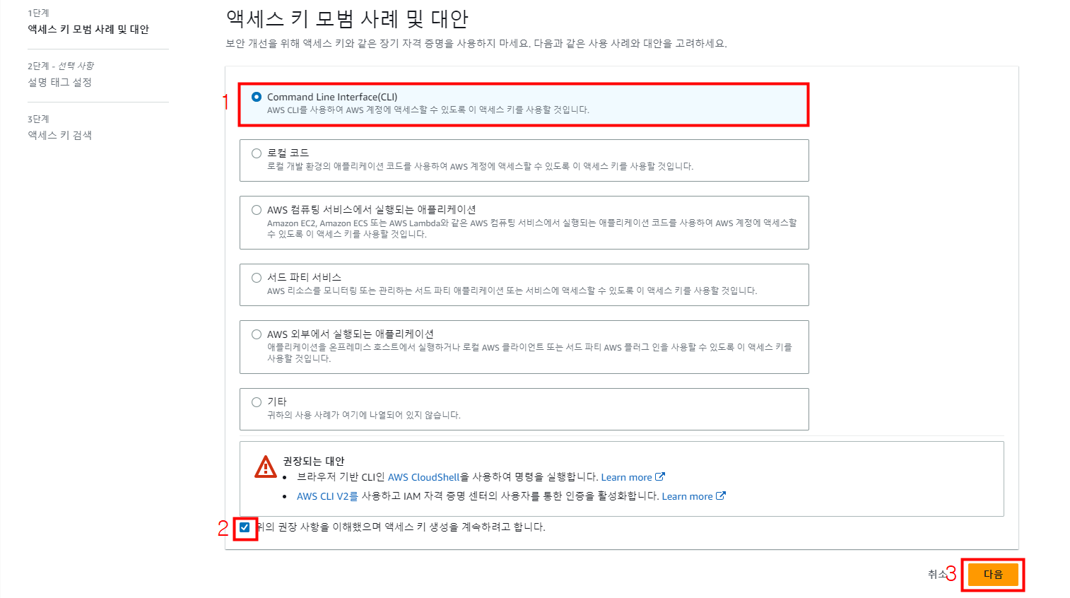 [Command Line Interface(CLI)] - 권장 사항 체크 - [다음]을 눌러 줍니다.
