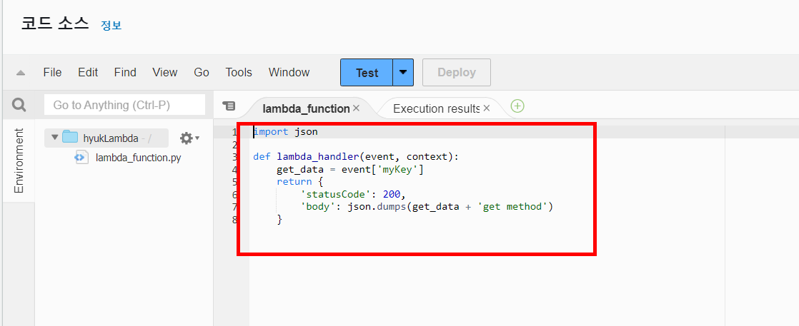 REST API GET 메서드 실습을 위해 다음과 같이 Lambda 함수를 작성합니다.
