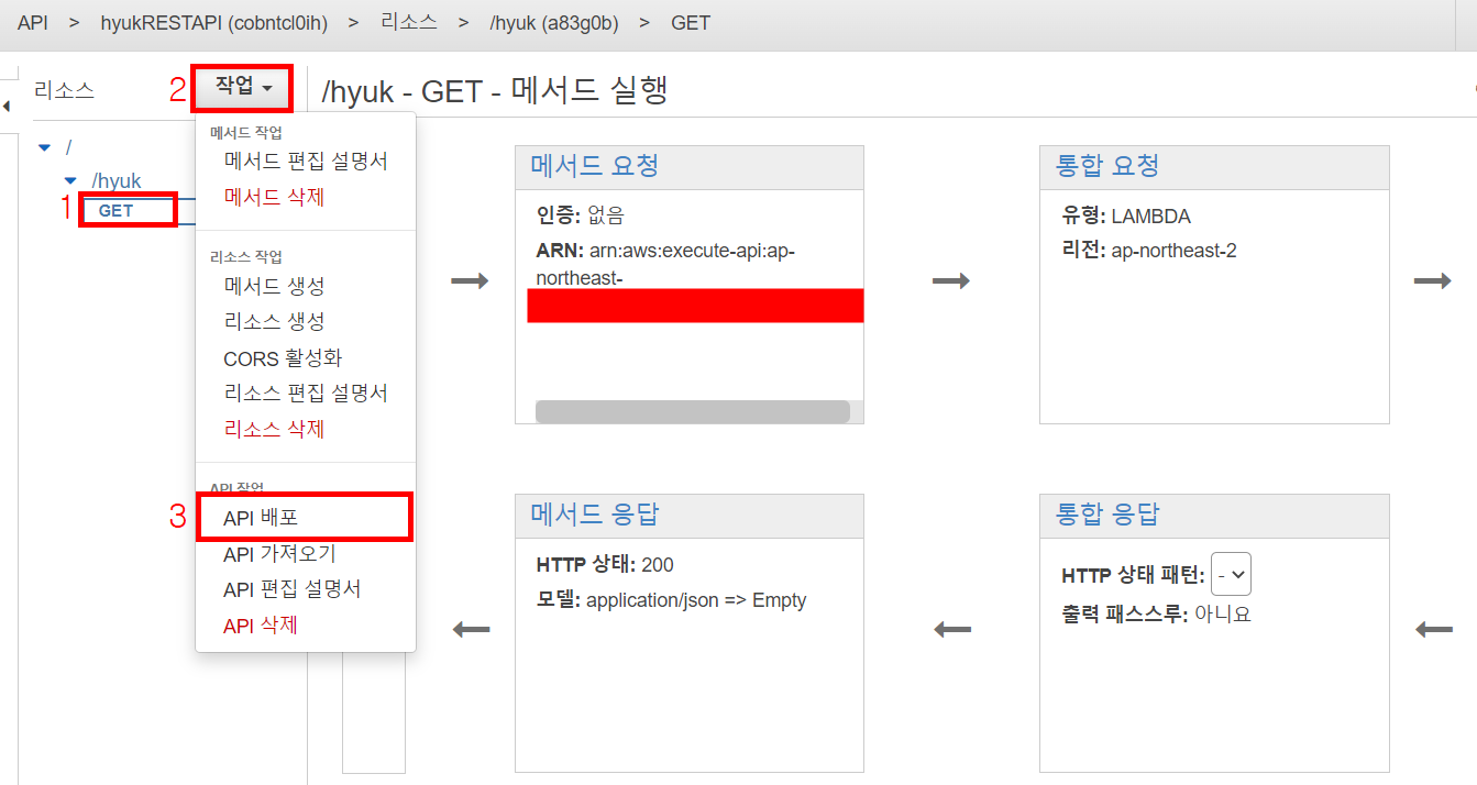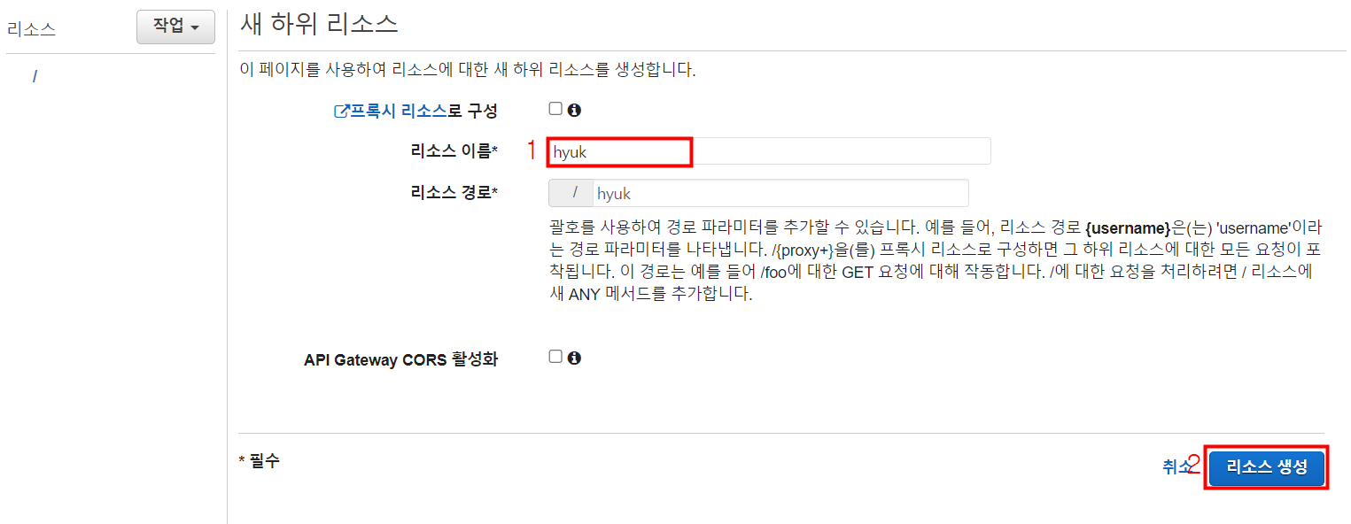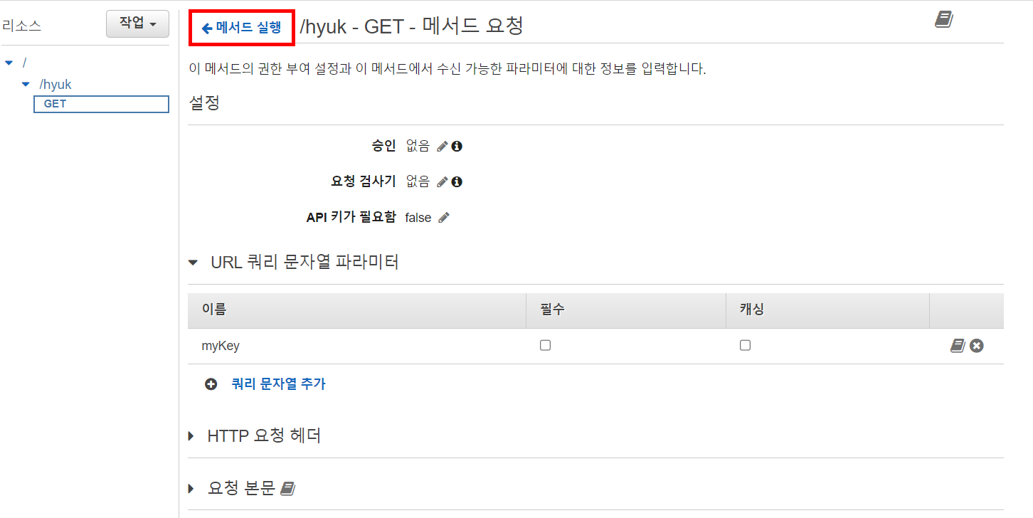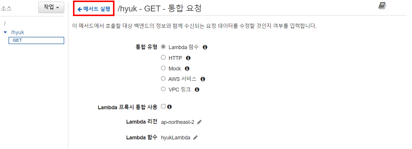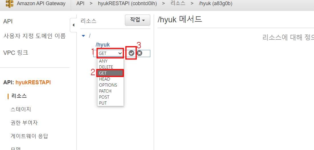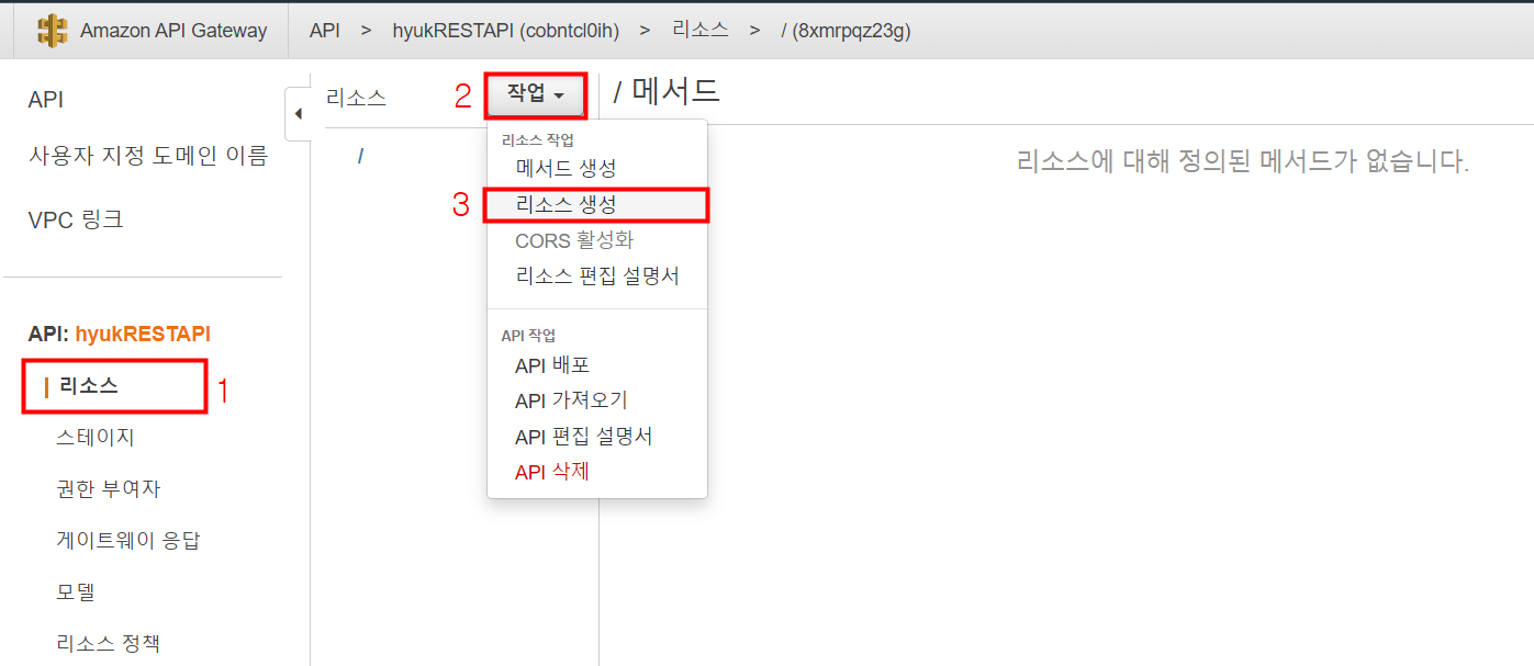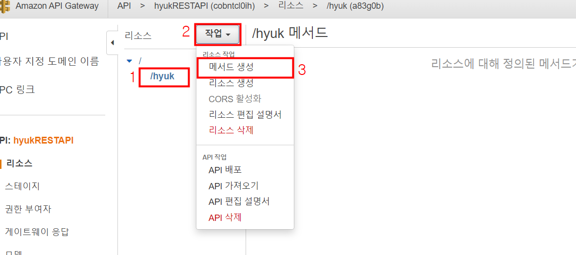 메서드를 생성하기 위해 다음과 같이 [/hyuk]이라는 리소스를 선택한 후 [작업] - [메서드 생성]을 선택합니다.