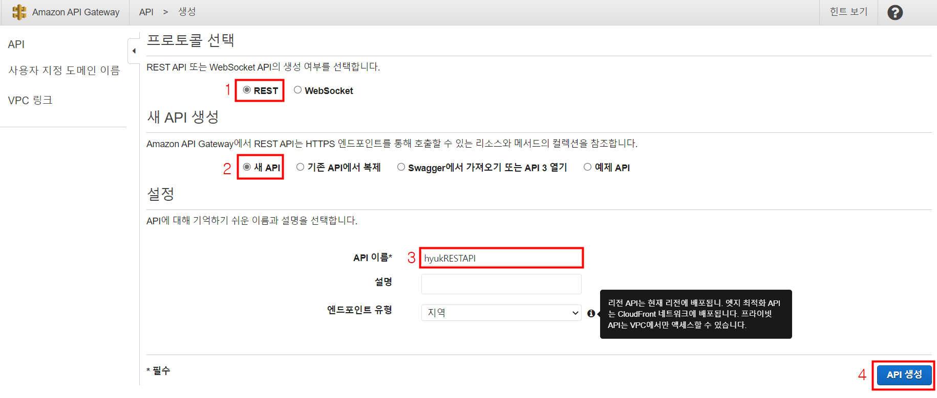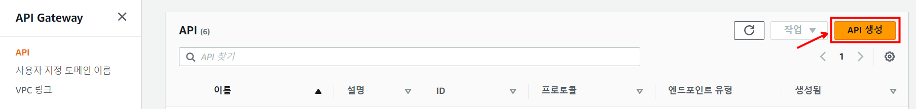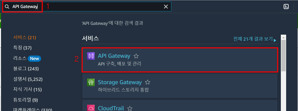 AWS 콘솔에서 API Gateway를 검색한 후 선택합니다.