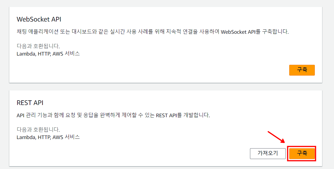 실습할 내용은 REST API이기 때문에 REST API [구축]을 선택합니다.