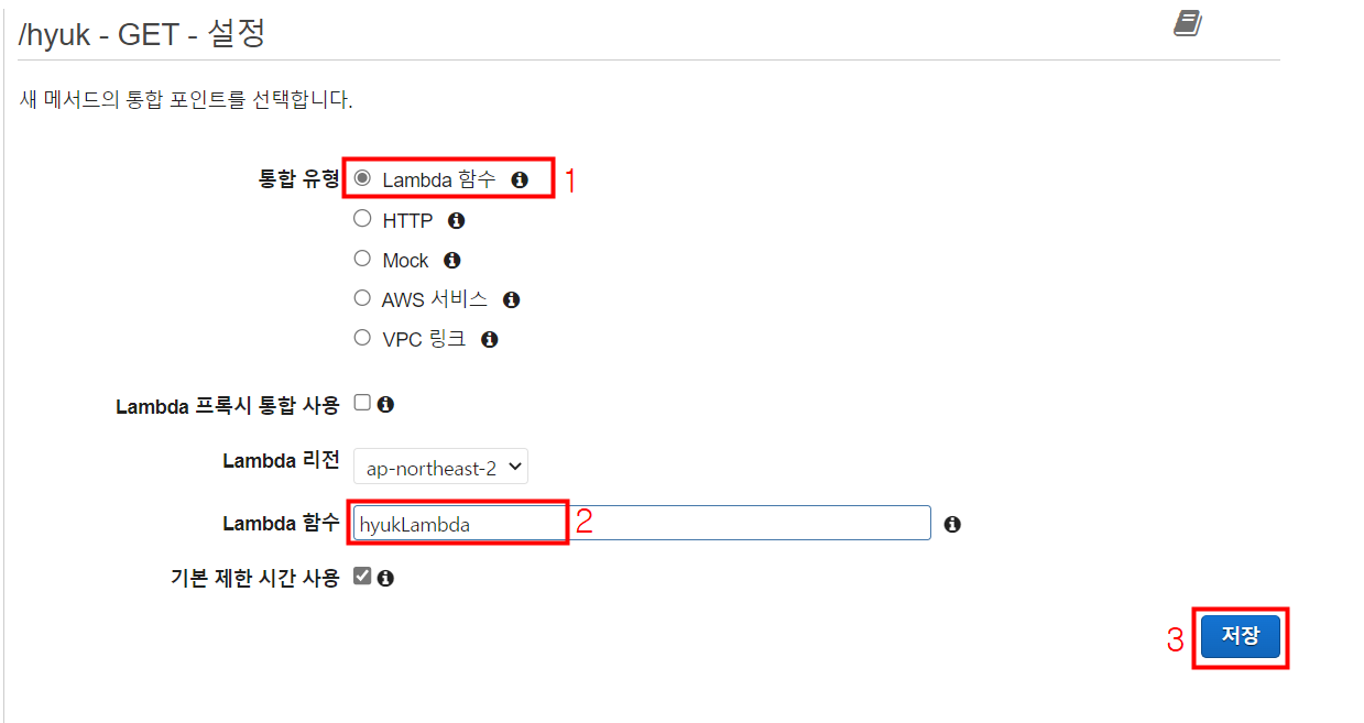 통합 유형으로 Lambda를 선택하고 만들어주었던 Lambda 함수를 지정한 후 [저장] 합니다.