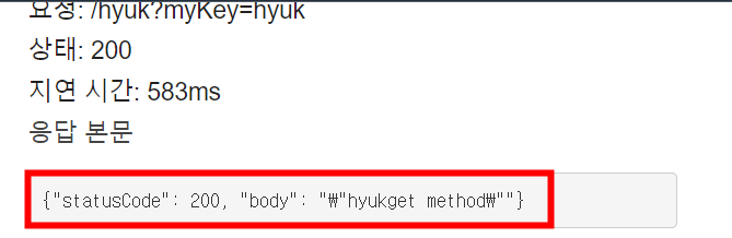 URL 파라미터 부분에 Key와 Value 값을 넣으면 Lambda 함수의 return 값으로 들어가는 것을 확인할 수 있습니다.
