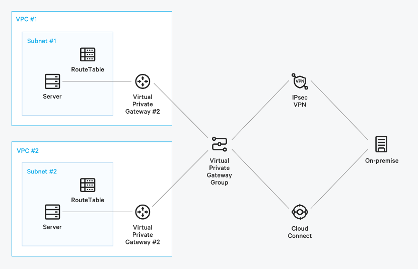 VPG(Virtual Private Gateway)는 VPC에 위치하여 On-premise 네트워크를 Cloud Connect 또는 IPsec VPN으로 연결하는 접점입니다.