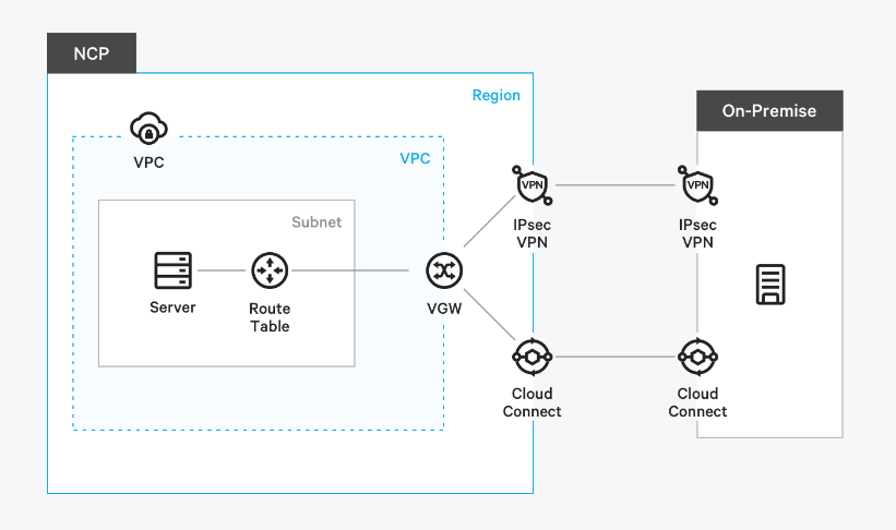 NCP의 VPG를 사용하면 클라우드 내의 VPC와 온프레미스 네트워크를 VPN을 설정하여 확장할 수 있고 이를 통해 온프레미스 데이터 센터와 클라우드 리소스 간에 안전한 통신을 구축할 수 있습니다.