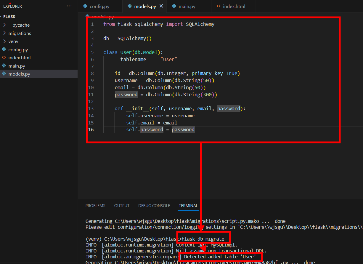 migrations 파일에서 변경 사항을 감지하여 migrate하기 위해 flask db migrate를 합니다.