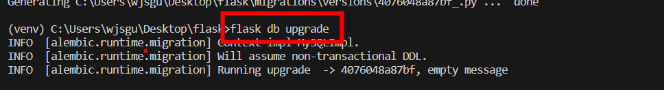 데이터베이스에 migrate를 적용하기 위해 flask db upgrade를 합니다.